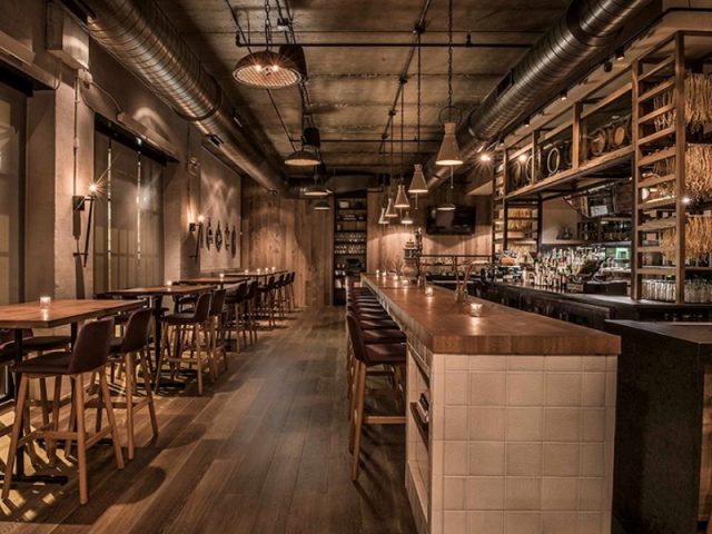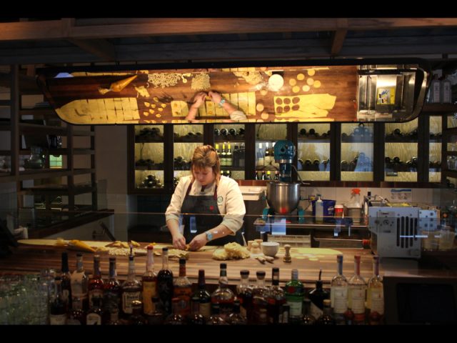 I’m a big fan of Monteverde’s dark, moody design aesthetic, which shines at night. The furnishings and décor do a great job creating an environment that’s both industrial and rustic – with the custom Urban Electric (a favorite vendor!) ceiling fixtures as a prime example. One feature I love in particular is the bar, behind which is a pastificio where you watch the chefs’ hand-make pasta through an elevated, angled antiqued mirror. A fun bonus as you sip on a cocktail and wait for a table!