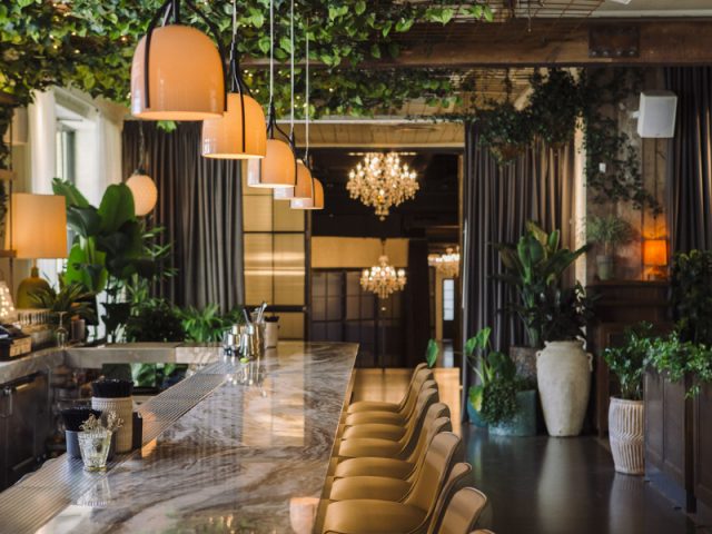 Aba is one of those restaurants that truly wows upon arrival. The entrance is a small, un-assuming lobby, and from there you take an elevator that opens on a legitimate Mediterranean oasis. Aba’s interiors blend seamlessly with the exterior patio and bar. Thanks to the greenhouse glass roof, a wall of large south-facing windows, and lush greenery throughout – I love that we’re able to experience that indoor/outdoor feeling, even in wintertime. It’s amazing how much warmth and positive energy interior greens – in this case overhanging trees, potted plants, and ceiling vines – bring to an interior space. The twinkle lights that illuminate the bar and trees don’t hurt either!