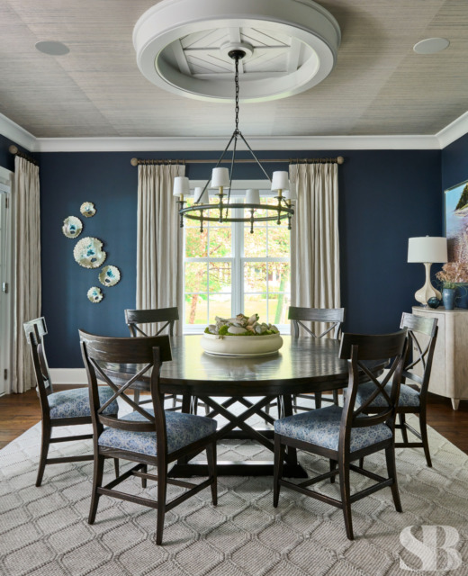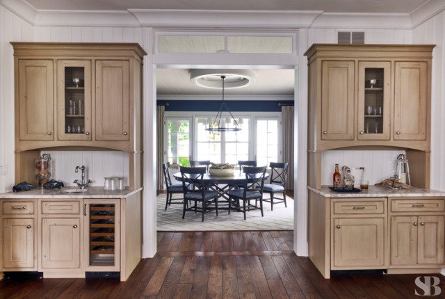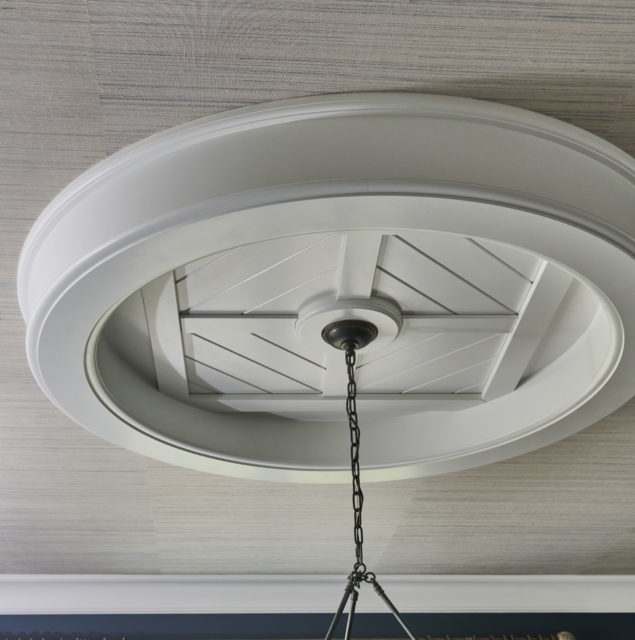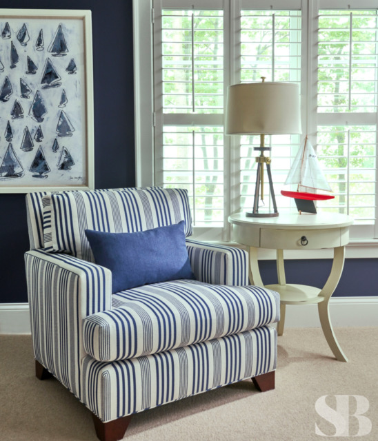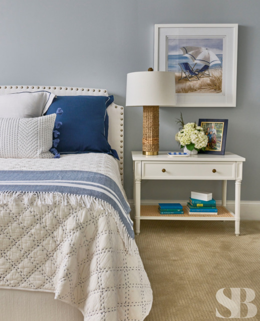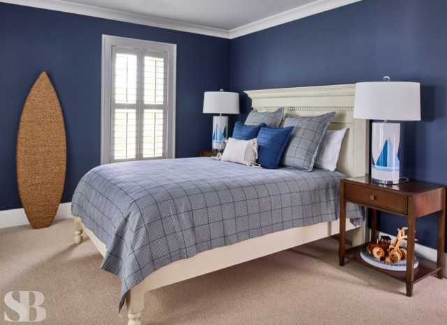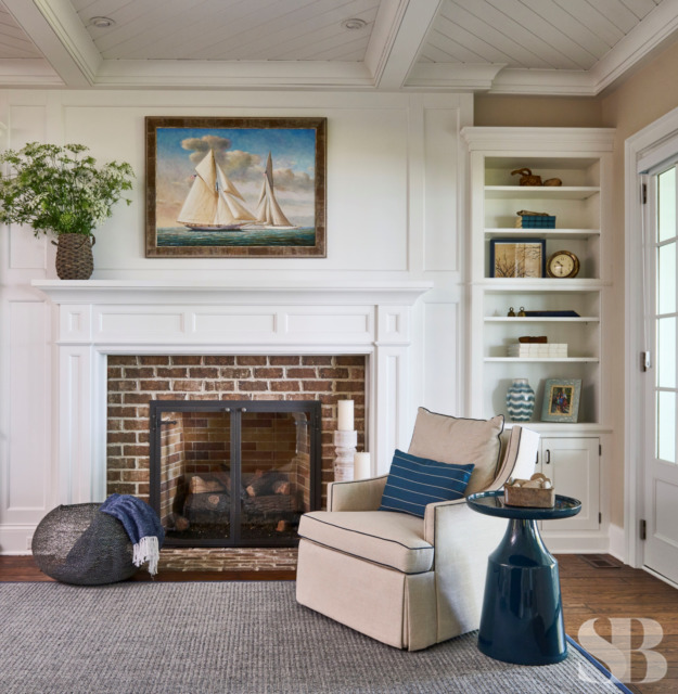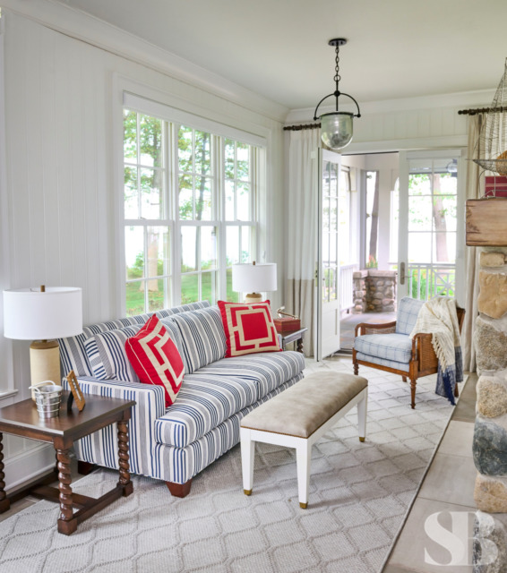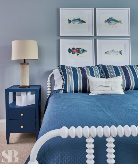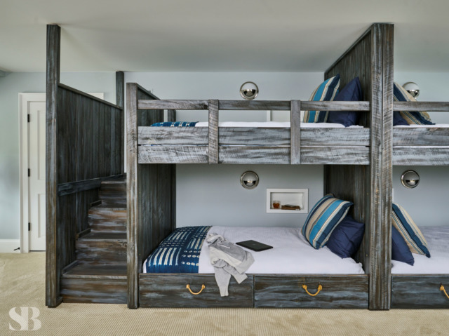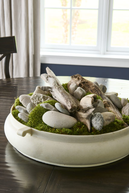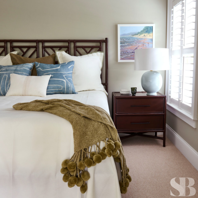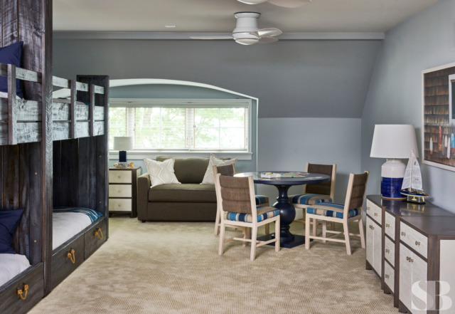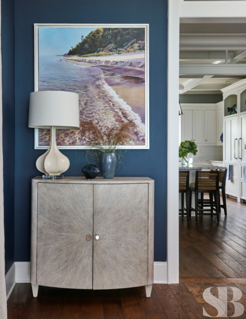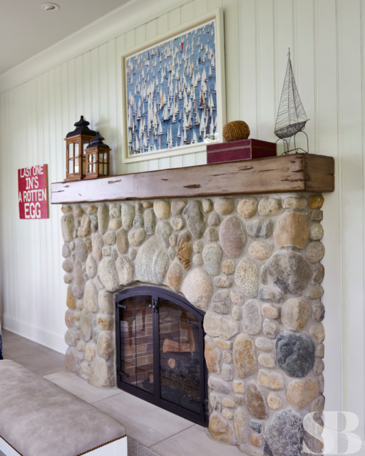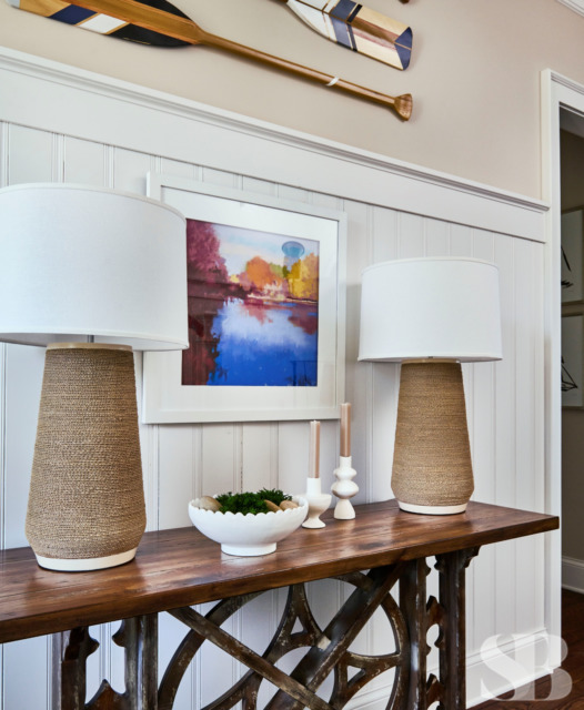 Our objective was to elevate the existing nautical theme and make the rooms more cohesive, with an emphasis on durability for withstanding both lake life and frequent guests. Creating flexible floorplans was our first priority; we extended the kitchen countertop to fit six counter stools around the island, with seats upholstered in faux leather – perfect for wet or sandy children coming in for a quick lunch. A new sectional, swivel chairs and ottomans in the main living room created an abundance of seating that’s easily re-arranged for different activities – game night, movie night, or relaxing in front of the fireplace. Pull-out sofas were added to one of the kids’ bedrooms and the bunk room to maximize sleeping arrangements. It was important to the client that the home fit within the landscape- so we drew our inspiration for aesthetic details from what we could see. The color palette is reflective of the Lake Michigan horizon, while the white quartzite kitchen countertops have blue and taupe veining that mirror the clouds in the sky and the sand on the beach. The art throughout the home was sourced from local Michigan artists, helping connect the home to its surroundings. Additional nautical details, like decorative canoe paddles and sailboat lamps, were mixed with nature-inspired accessories like a dining table centerpiece sourced from the kids’ rock collections. The result? A family-friendly lake home that truly functions as a second home – a space to relax and have fun, rather than a place to just come and go.