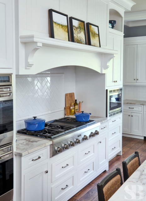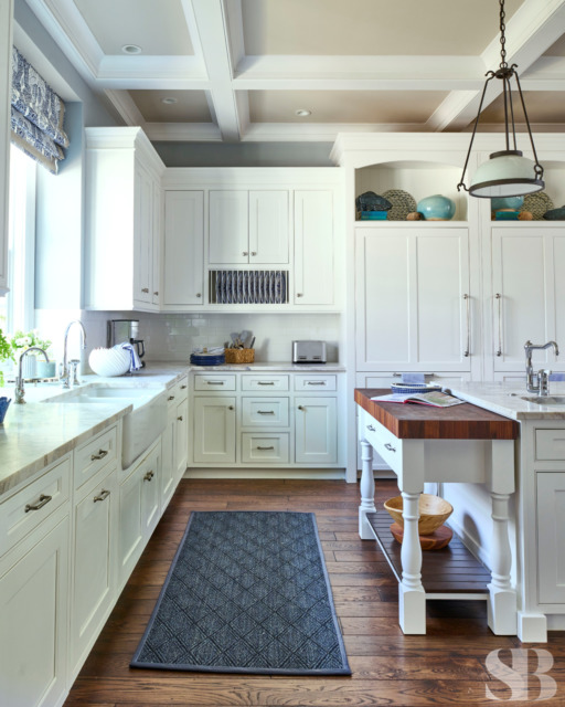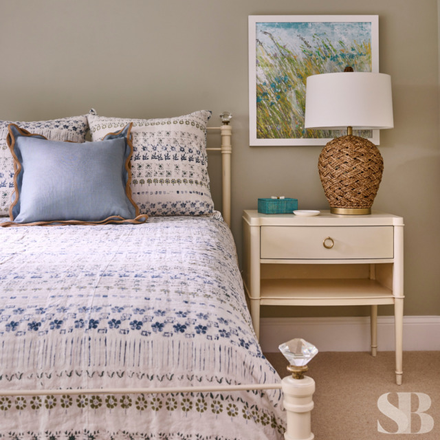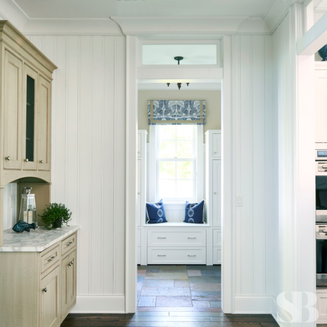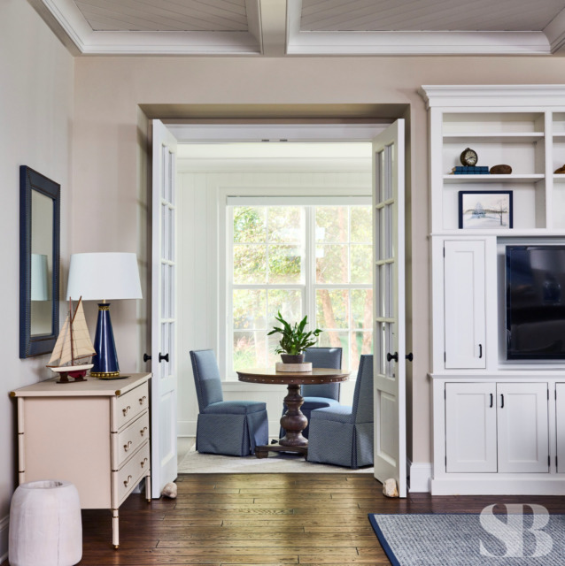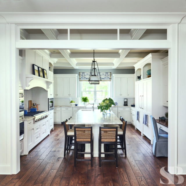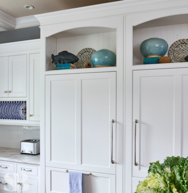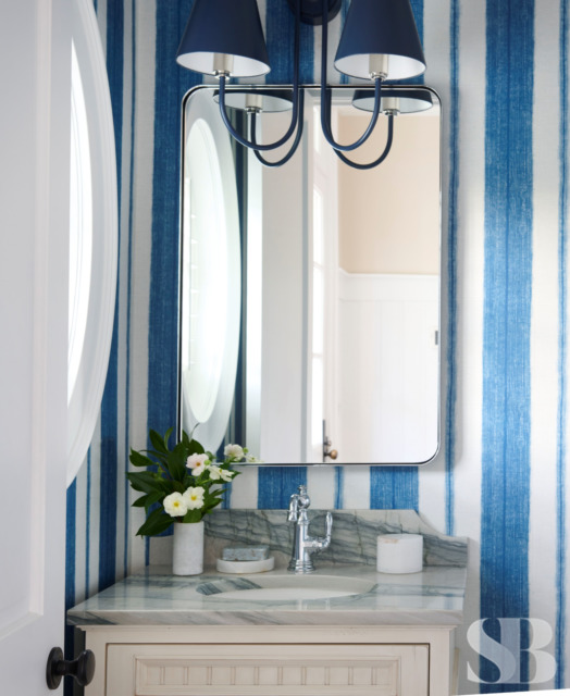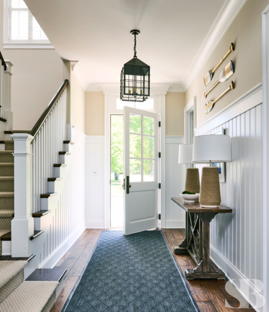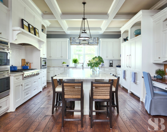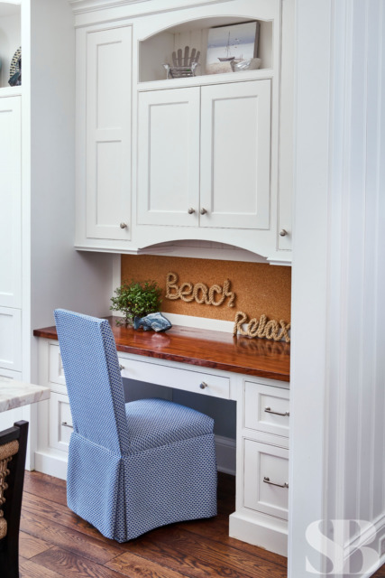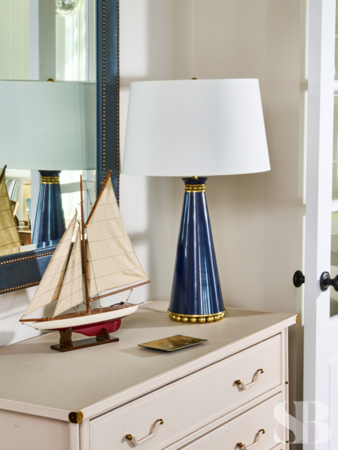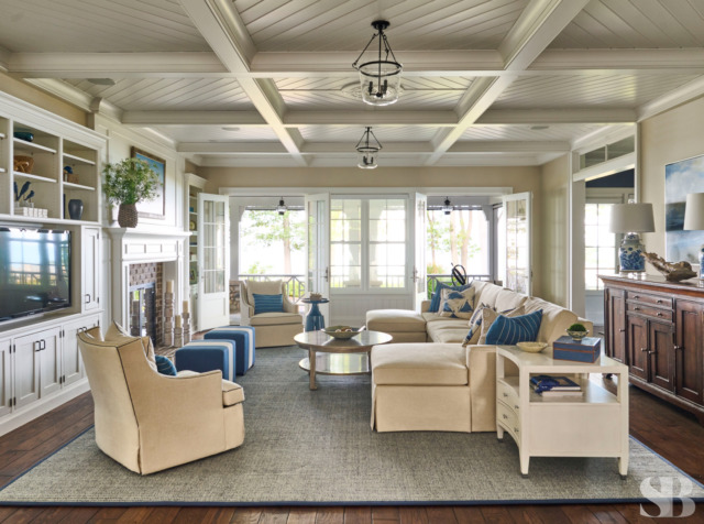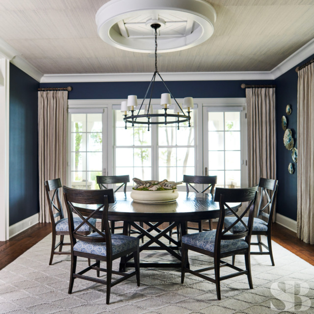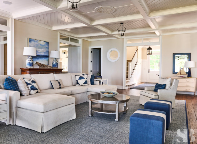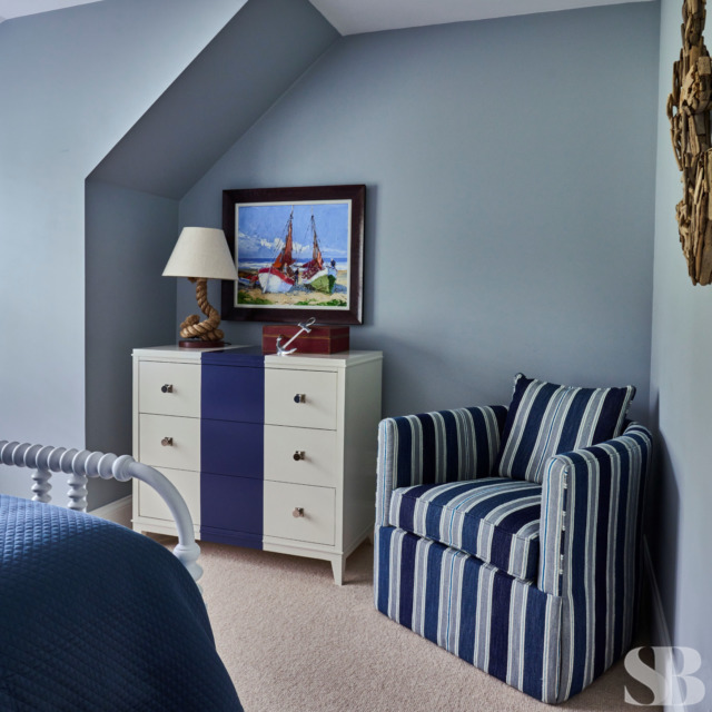 Our objective was to elevate the existing nautical theme and make the rooms more cohesive, with an emphasis on durability for withstanding both lake life and frequent guests. Creating flexible floorplans was our first priority; we extended the kitchen countertop to fit six counter stools around the island, with seats upholstered in faux leather – perfect for wet or sandy children coming in for a quick lunch. A new sectional, swivel chairs and ottomans in the main living room created an abundance of seating that’s easily re-arranged for different activities – game night, movie night, or relaxing in front of the fireplace. Pull-out sofas were added to one of the kids’ bedrooms and the bunk room to maximize sleeping arrangements. It was important to the client that the home fit within the landscape- so we drew our inspiration for aesthetic details from what we could see. The color palette is reflective of the Lake Michigan horizon, while the white quartzite kitchen countertops have blue and taupe veining that mirror the clouds in the sky and the sand on the beach. The art throughout the home was sourced from local Michigan artists, helping connect the home to its surroundings. Additional nautical details, like decorative canoe paddles and sailboat lamps, were mixed with nature-inspired accessories like a dining table centerpiece sourced from the kids’ rock collections. The result? A family-friendly lake home that truly functions as a second home – a space to relax and have fun, rather than a place to just come and go.