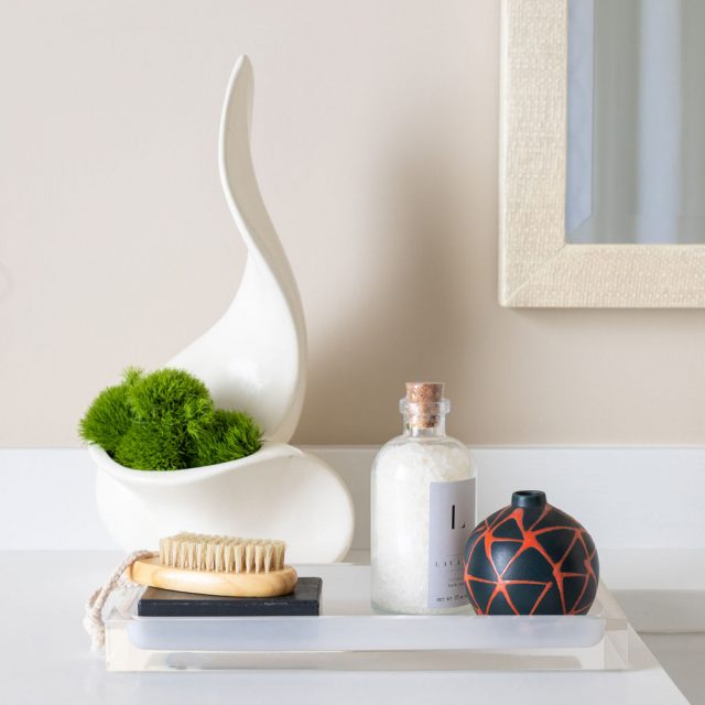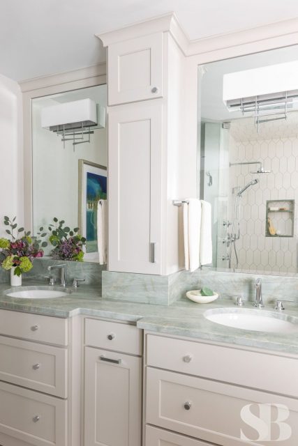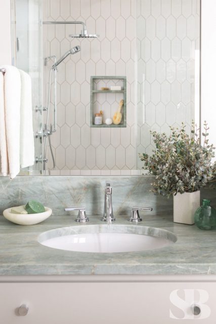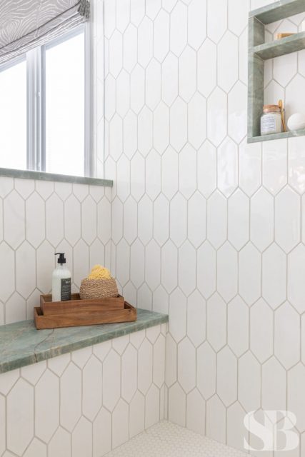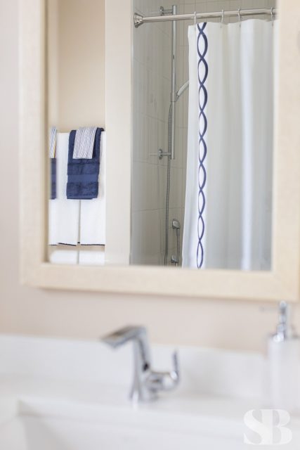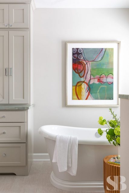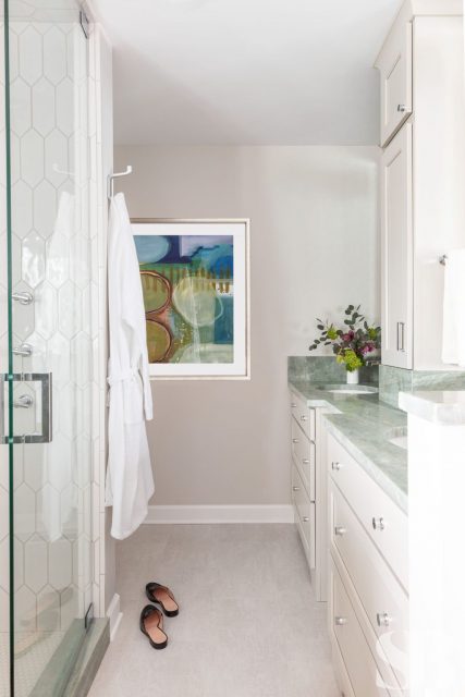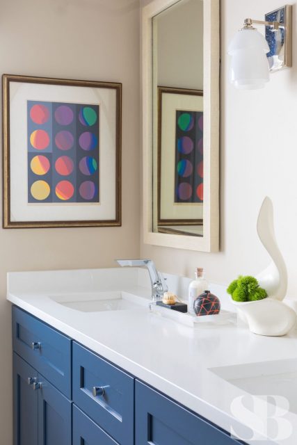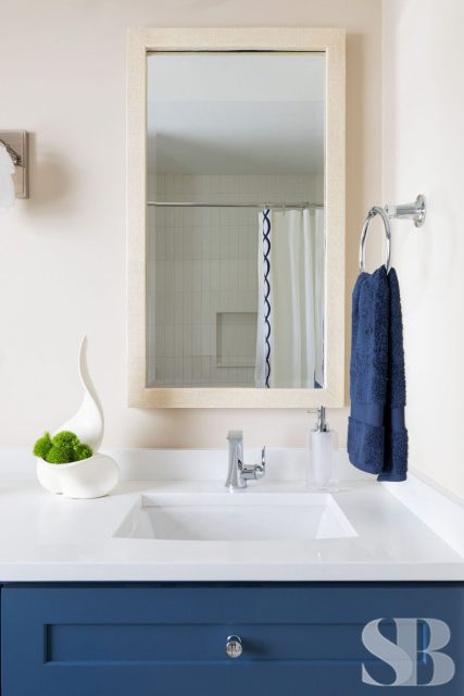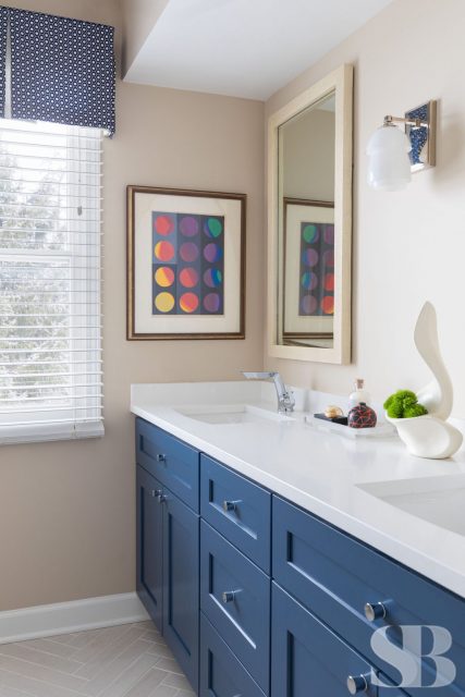No ordinary, all-white master bath would do for this color-obsessed client! This remodel focused on three primary initiatives: a larger, steam shower, bigger vanities and more storage. To accommodate these wishes, we left the toilet location and window location static changed to a freestanding tub, added a linen cabinet, seat and niche in the shower (great for aging in place!), upper cabinet between the two sinks and lots of drawers! To hide the steam shower valves and create an open and airy feel, we included a knee wall inside the door (which is also great for an additional towel bar!). Our client fell absolutely in love with the green marble countertop slab within 5 minutes of being at Terrazzo & Marble (our go-to for slab selections), which provided us with a starting point for the aesthetics and allowed us to incorporate color in a unique way. We selected the elongated hexagonal shaped wall tile with a green outline and larger, neutral, anti-slip floor tile to correlate with the pale taupe cabinets. We added finishing touches through colorful artwork and a neutral animal print window treatment for some added personality! For the guest bath, we left the footprint of the space static while adding new cabinets, countertops, lighting, shower tile, paint, window treatments and accessories for a slight face-lift. We parlayed our client’s love of color into the cabinetry with a bold blue, ensuring this guest bath makes a big statement.