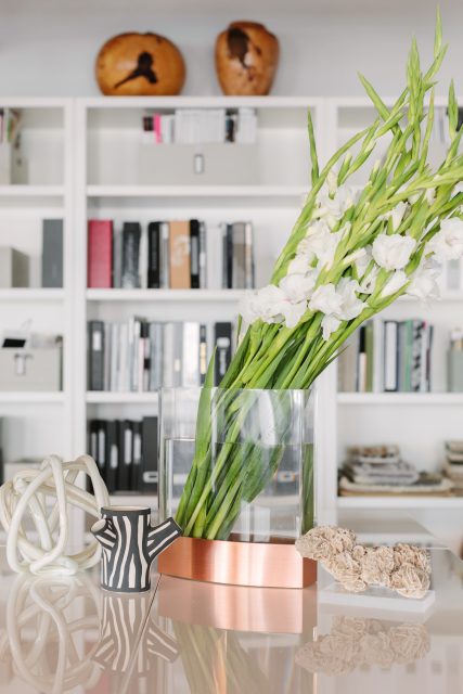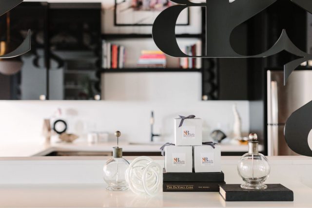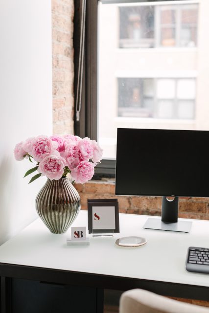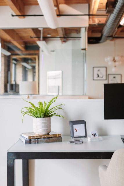Space planning was the key element in the design process as we set to move our Chicago Studio, growing our commercial workspace from 500 SQFT to 2200 SQFT. We transitioned an empty and open floor plan to be functional for our needs, including an office for Susan, a designer library, a kitchen, two separate storage rooms, a conference room and individual and co-working space for all team members. Located in an old bicycle manufacturing warehouse, the steel beams, brick walls, unfinished ceilings and original wood floors were the basis of our creative inspiration for our new office. We installed black lacquer cabinets with white quartz countertops, added black plumbing fixtures and brushed brass light fixtures throughout and re-painted the steel beams and window frames black to juxtapose the new and old, lending balance to the space. Interspersed with rugs from our Studio Brunstrum Home Elements collaboration with Julie Dasher Rugs, we incorporated deep teal, tobacco and white to add brightness without being overwhelming, letting the interiors we design within our office be the center of attention. For a personal touch and an unexpected element, we custom designed a Studio Brunstrum floating logo wall between the kitchen and the library.