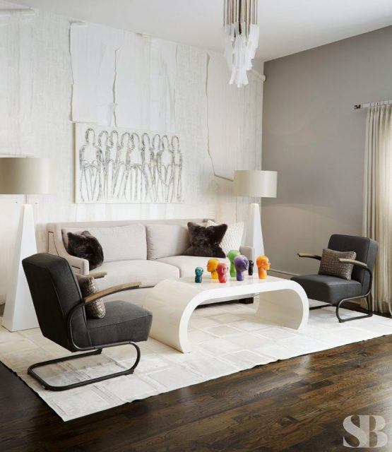 We can easily imagine this eclectic space as the lobby of a hip, urban boutique hotel with its intimate conversation area, sleek fireplace and artwork. But it would work just as well as a gathering spot at home for family and friends in a trendy neighborhood. The sophisticated, off-white color palette comes alive with colorful paintings, glass sculptures and a “zebra” hair on hide rug. Texture adds interest in the form of “deconstructed” wallpaper – a conversation piece with its ripped, torn and semi-rolled applications – and a dash of fur on pillows and seating.