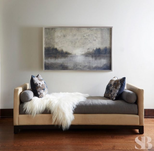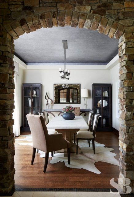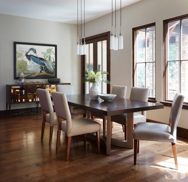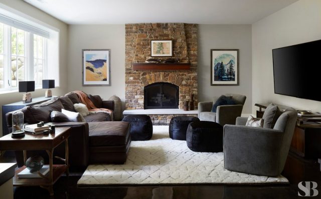 After years of relocating from state to state, an orthopedic surgeon, his wife and their three children settled down and built a Rocky Mountains-inspired home reminiscent of the father’s home state of Colorado. The clients selected lodge-like finishes for their new residence – chunky stone archways and fireplaces, slate accent tiles and oak floors. We finished the interior in an organic, textural and refined style suitable for a family of five. The furnishings are comfortable and durable yet not overly masculine or too Western-esque. For a seamless transition to the heavily wooded property outside, we drew from Chicago and Canadian artists for the artwork in earthy shades of gray and blue, cream, bark and mushroom.