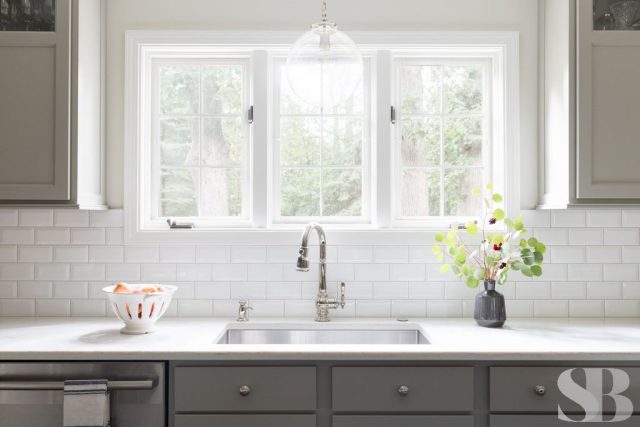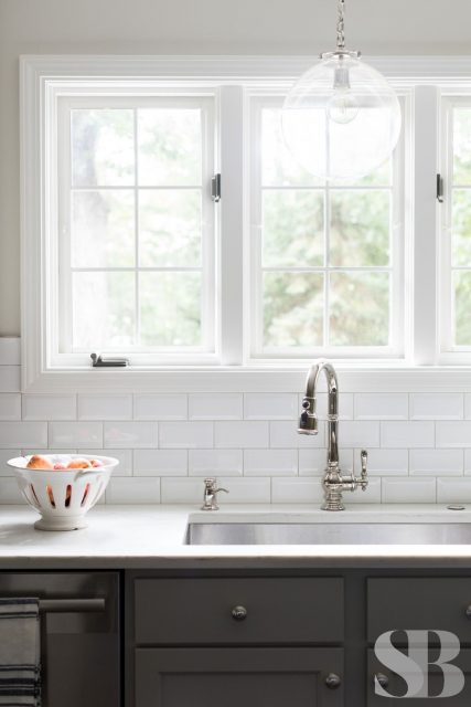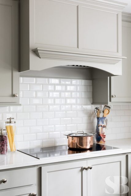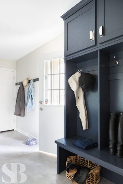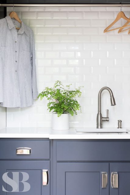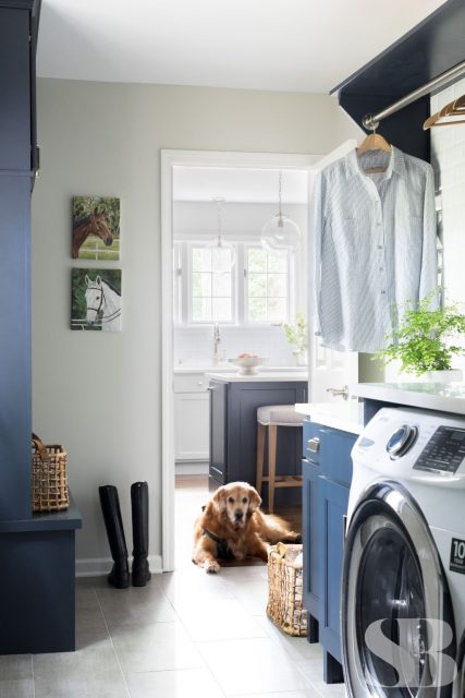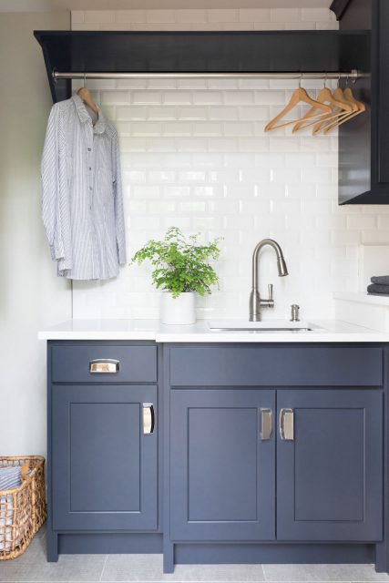 The relocation timeline for this executive and his family significantly shortened our project deadline, giving us only 5 weeks to make minor updates throughout the home (new paint colors, staining the floors, updating window treatments, and moving electrical), relegating the extensive kitchen and laundry room renovation to a secondary project. We initially evaluated whether the projects could be a simple refresh, but the functionality of the spaces weren’t conducive to the family’s lifestyle, necessitating a complete renovation. In an effort to work within the family’s budget, we opted to keep the existing room blueprint, leaving the entryways, windows, and door locations static. Instead, we shifted the cabinetry layout to center the oven within a wall, flanked by two shallow pantries, moved the refrigerator out from the edge of the wall to create a landing space for coffee, and added an island with a convenient spice rack and glass-encased bookshelves for increased storage space. In the laundry room, we removed an existing closet to make room for cubbies, a hanging rack, and additional storage space above the W/D to house the family’s horseback riding accoutrements. As the family’s primary entrance/exit into their home, we were diligent in ensuring the rooms flowed with each other and the rest of the home. Inspired by the various hues of blue we used throughout the home, we opted for a bright navy on the kitchen island and the laundry room cabinets, brightening the spaces, adding dimension from the dove gray cabinetry, and complementing the streaks of blue within their porcelain quartz countertops. For increased continuity, we used the same hardware finishes throughout both rooms.
