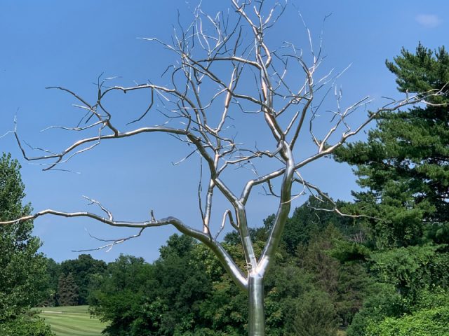 • Located outside the main entrance was another stainless-steel tree sculpture by the same artist Roxy Paine, only this one was titled “Yield”.