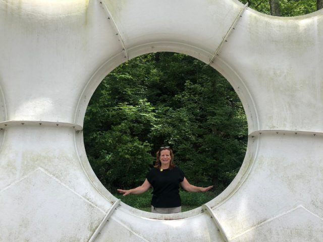 • Crystal Bridges takes its name from a nearby natural spring and the bridge construction that supports the building. Architect Moshe Safdie designed a series of pavilions nestled between two spring fed ponds that house the art galleries. He also provided rest stops along the way… much like a palette cleanser between a seven-course meal! As always, the element of water fascinated me. Interspersed amongst the steel and wood buildings were many glass pieces by Dale Chihuly as well as a pair of striking blue chandeliers inside. The outdoor pieces that most captured my attention were the floating glass spheres in the ponds. They were reminiscent of my time spent in Sweden with glass artists in their galleries.