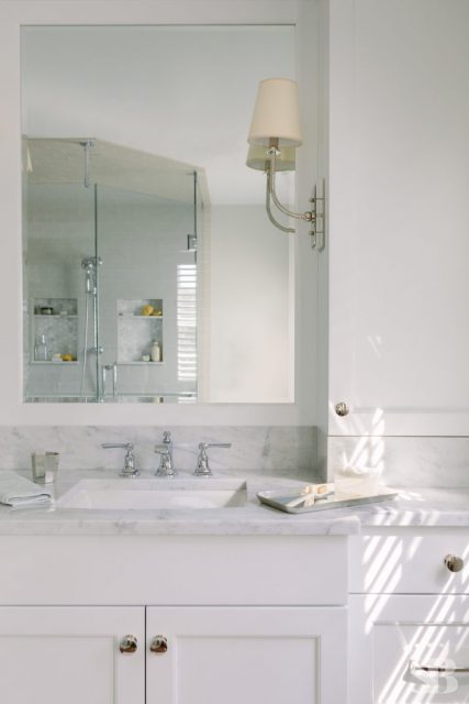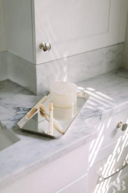 These clients returned to Studio Brunstrum to renovate their master bathroom after having completed their laundry room, dining room, living room, family room and hall bath a few years prior. We completely transformed their outdated “builder grade” suburban master bathroom into a sophisticated oasis. After moving the toilet across the room, enlarging the shower, removing the bathtub and replacing a closet with by-pass doors to a wall of cabinetry to maximize storage space, we still faced the challenge of making the formal marble that our client adored fit with the rest of their comfortable and casual home. By introducing the pale green crackle-glazed tile in the shower and wood grain porcelain plank on the floor, we toned down the formality of the marble slabs to ensure the bathroom was cohesive with the rest of the home.